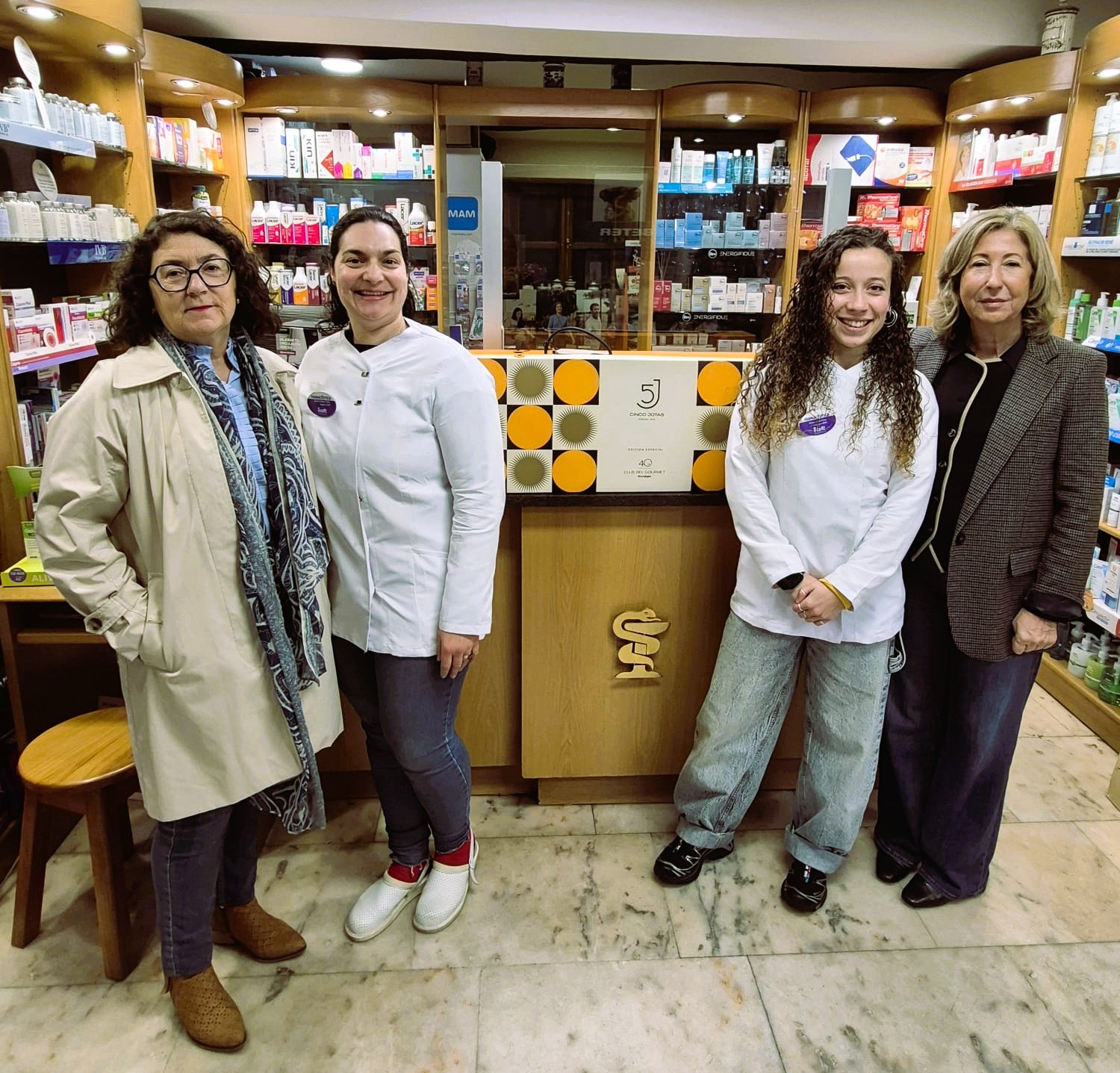 La presidenta del COFC, Sara Catrain, y la directora técnica de FEGEREC, llevaron esta mañana el lote de productos, que incluye un jamón de bellota Cinco Jotas, a las farmacéuticas de esta botica santiaguesa.