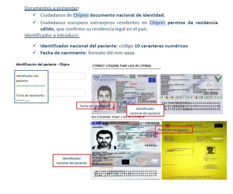 Los códigos de identificación de los pacientes varían entre países, además algunos países incluyen un segundo identificador (por ejemplo Portugal) para el acceso.