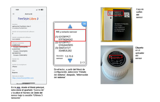Localización del número de serie en la aplicación y en el lector FreeStyle Libre 3, así como en la caja de cartón del sensor y en la etiqueta del aplicador del sensor FreeStyle Libre 3 Plus