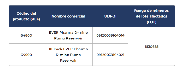 La Agencia Española de Medicamentos y Productos Sanitarios (AEMPS) ha tenido conocimiento, a través de la empresa fabricante EVER Neuro Pharma GmbH (Austria), de problemas en el llenado de los depósitos para la bomba EVER Pharma D-mine con apomorfina o en la administración de la misma.